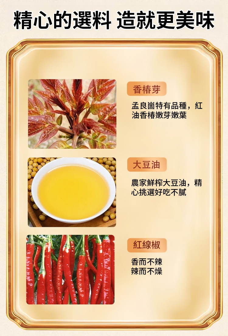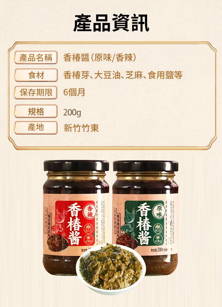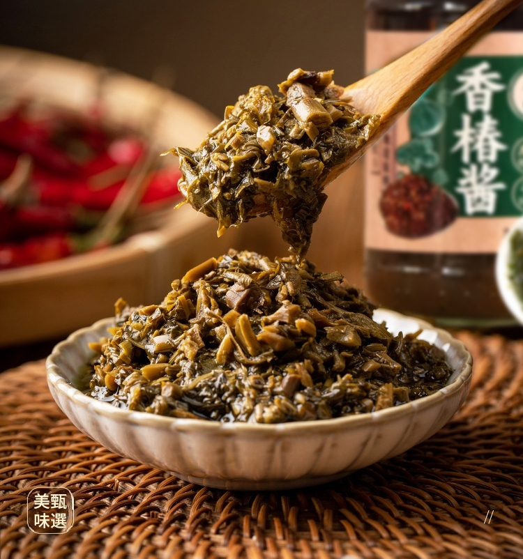 ✅精選新竹竹東特產頭茬嫩葉人工摘取✅不加蔗糖與防腐劑,純天然香椿鮮香。50年老師傅手藝,香辣下飯、芽嫩肥厚、色澤油亮誘人✅鹹香爽口不油膩,拌飯、拌麵、夾饃(刈包)、烹飪、蘸餃子、炒菜都好用